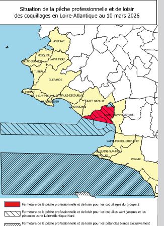 Situation de la Pêche de loisir au 10 mars 2026: -Interdiction pour contamination bactériologique ou toxycologique: - - Fermeture des zones 44.09 (Estuaire de la Loire - Saint Brevin les Pins) coquillages du groupe 2 (fouisseurs coques, palourdes...) - Vigilance sanitaire en raison des fortes pluies de ces derniers jours: Voir le communiqué de l'ARS - Saint Brevin le Pins: Plage des Pins sud...Voir l'Arrêté Municipal - Zone 8: De la pointe St Gildas à l'étier du Collet gisement au large "les cheveaux": pétoncles blancs (coquillettes) - Zone loire Atlantique nord gisement au large: pétoncles -coquilles St Jacques Voir l'Arrêté Préfectoral - Interdiction de la pêche de loisir secteur Joallant Commune de la Plaine sur Mer... Voir l'Arrêté Municipal - Réouverture de la pêche professionnelle zone 44.09 Estuaire de la Loire (coques et palourdes) à compter du 6 octobre 2025... Voir l'Arrêté Préfectoral - Zone 44.07.02 Baie de la Baule: Ouverture de la pêche aux coques à compter du 6 Octobre 2025... Lire l'Arrêté Informations complémentaires sur le site de la Direction Mer Littoral Rappel: Interdiction de nettoyage des coquillages à l'intérieur du plan d'eau de la Bernerie en Retz. Marées et Prévisions Météo de la semaine