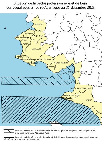 Situation de la Pêche de loisir au 31 décembre 2025: -Interdiction pour contamination bactériologique ou toxycologique: - - Zone 8: De la pointe St Gildas à l'étier du Collet gisement au large "les cheveaux": pétoncles blancs (coquillettes) - Zone loire Atlantique nord gisement au large: pétoncles -coquilles St Jacques Voir l'Arrêté Préfectoral - Interdiction de la pêche de loisir secteur Joallant Commune de la Plaine sur Mer... Voir l'Arrêté Municipal - Réouverture de la pêche professionnelle zone 44.09 Estuaire de la Loire (coques et palourdes) à compter du 6 octobre 2025... Voir l'Arrêté Préfectoral - Zone 44.07.02 Baie de la Baule: Ouverture de la pêche aux coques à compter du 6 Octobre 2025... Lire l'Arrêté Informations complémentaires sur le site de la Direction Mer Littoral Rappel: Interdiction de nettoyage des coquillages à l'intérieur du plan d'eau de la Bernerie en Retz. Marées et Prévisions Météo de la semaine