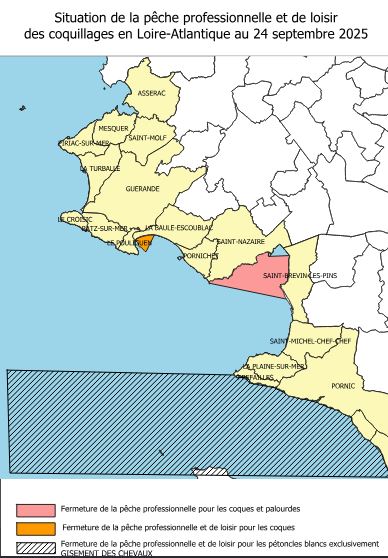 ![]() | ![]() -Interdiction pour contamination bactériologique ou toxycologique: - - Interdiction de la pêche de loisir secteur Joallant Commune de la Plaine sur Mer... Voir l'Arrêté Municipal - Interdiction de la pêche professionnelle zone 44.09 Estuaire de la Loire (coques et palourdes)... Voir l'Arrêté Préfectoral - Zone 44.07.02 Baie de la Baule: Ouverture de la pêche aux coques à compter du 6 Octobre 2025... Lire l'Arrêté Informations complémentaires sur le site de la Direction Mer Littoral Rappel: Interdiction de nettoyage des coquillages à l'intérieur du plan d'eau de la Bernerie en Retz. Marées et Prévisions Météo de la semaine