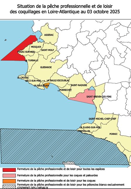 ![]() | ![]() -Interdiction pour contamination bactériologique ou toxycologique: - - Zone 44.04: De la pointe de Merquel au port de la Turballe: toutes espèces... Voir l'Arrêté Préfectoral - Interdiction de la pêche de loisir secteur Joallant Commune de la Plaine sur Mer... Voir l'Arrêté Municipal - Réouverture de la pêche professionnelle zone 44.09 Estuaire de la Loire (coques et palourdes) à compter du 6 octobre 2025... Voir l'Arrêté Préfectoral - Zone 44.07.02 Baie de la Baule: Ouverture de la pêche aux coques à compter du 6 Octobre 2025... Lire l'Arrêté Informations complémentaires sur le site de la Direction Mer Littoral Rappel: Interdiction de nettoyage des coquillages à l'intérieur du plan d'eau de la Bernerie en Retz. Marées et Prévisions Météo de la semaine