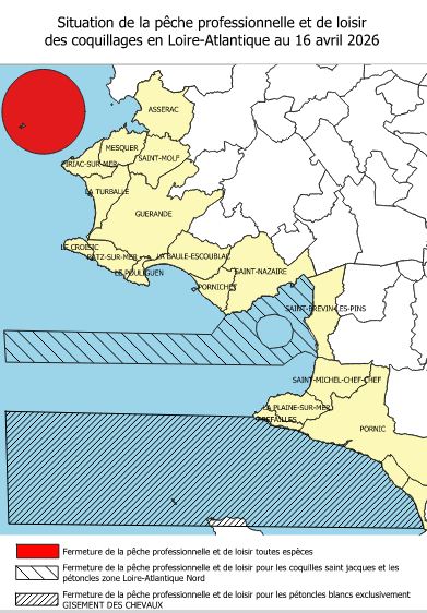 Situation de la Pêche de loisir au 27 mars 2026: -Interdiction pour contamination bactériologique ou toxycologique: - - Fermeture des zones 44.09 (Estuaire de la Loire - Saint Brevin les Pins) coquillages du groupe 2 (fouisseurs coques, palourdes...) - Vigilance sanitaire en raison des fortes pluies de ces derniers jours: Voir le communiqué de l'ARS - Saint Brevin le Pins: Plage des Pins sud...Voir l'Arrêté Municipal - Zone 8: De la pointe St Gildas à l'étier du Collet gisement au large "les cheveaux": pétoncles blancs (coquillettes) - Zone loire Atlantique nord gisement au large: pétoncles -coquilles St Jacques Voir l'Arrêté Préfectoral - Interdiction de la pêche de loisir secteur Joallant Commune de la Plaine sur Mer... Voir l'Arrêté Municipal - Réouverture de la pêche professionnelle zone 44.09 Estuaire de la Loire (coques et palourdes) à compter du 6 octobre 2025... Voir l'Arrêté Préfectoral - Zone 44.07.02 Baie de la Baule: Fermeture de la pêche aux coques à compter du 30 mars 2026... Lire l'Arrêté Informations complémentaires sur le site de la Direction Mer Littoral Rappel: Interdiction de nettoyage des coquillages à l'intérieur du plan d'eau de la Bernerie en Retz. Marées et Prévisions Météo de la semaine